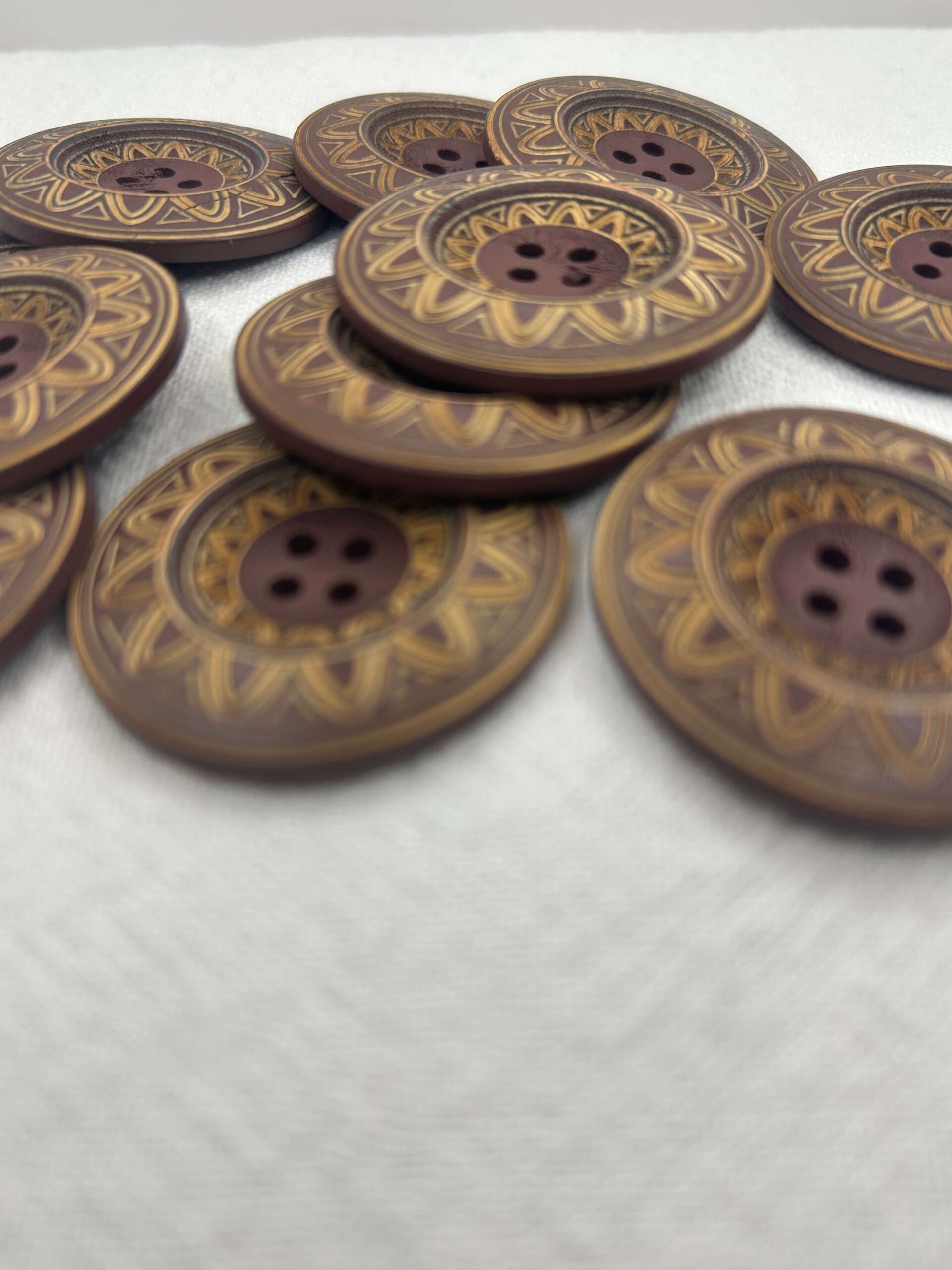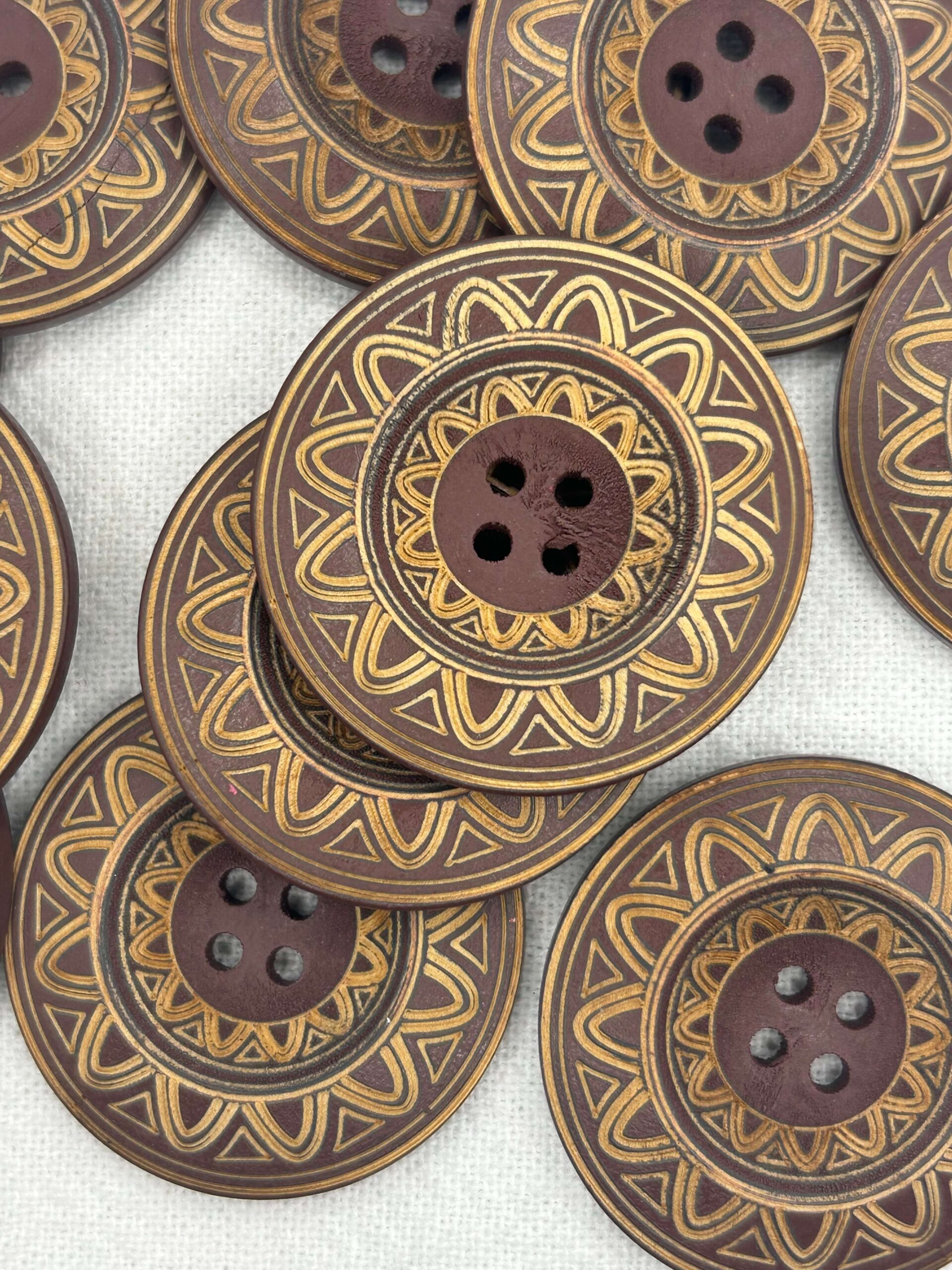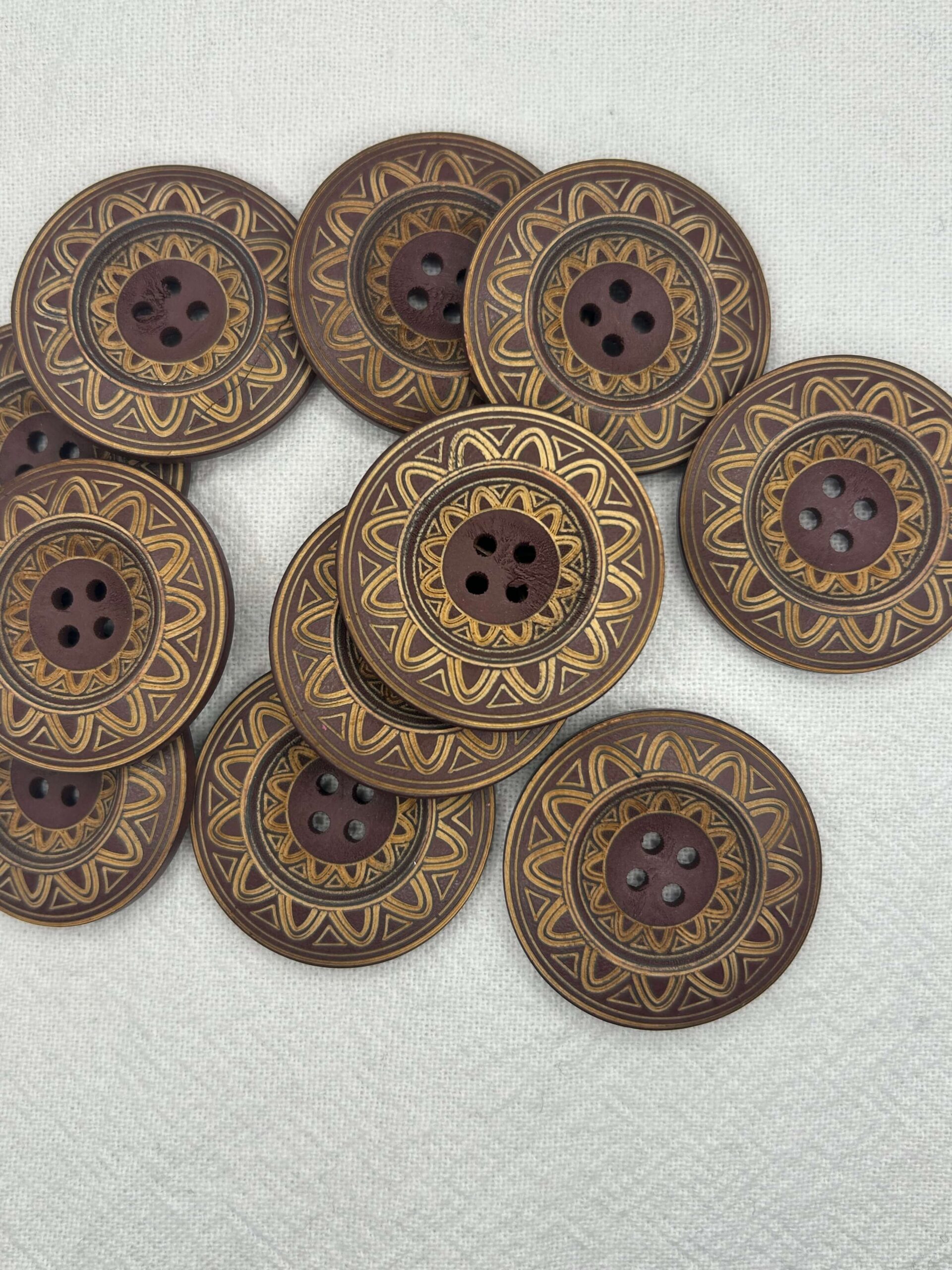 Oversized 36mm natural wood button with sunburst pattern and four holes. Handmade, perfect for jackets, cardigans, and statement DIY projects.