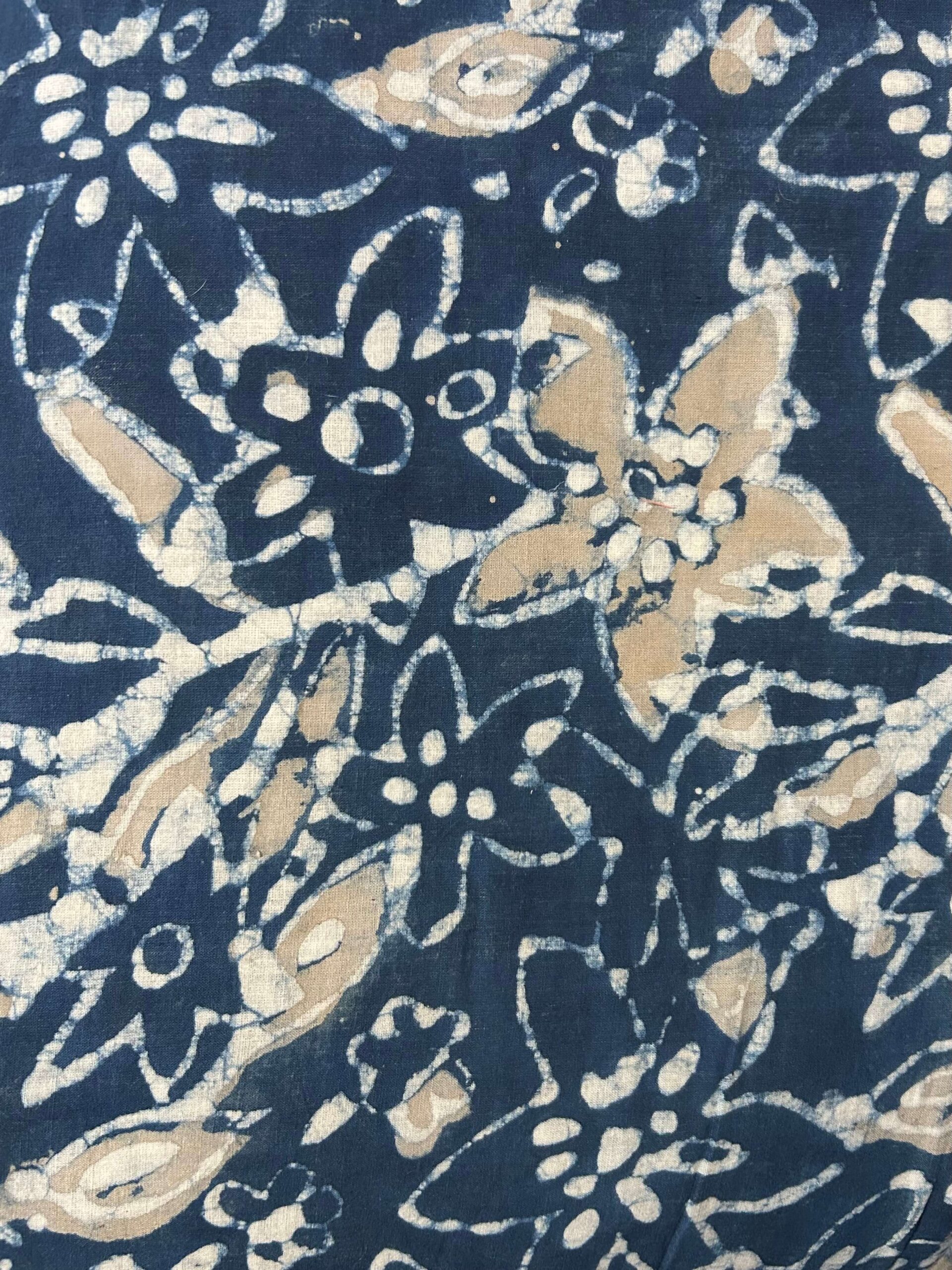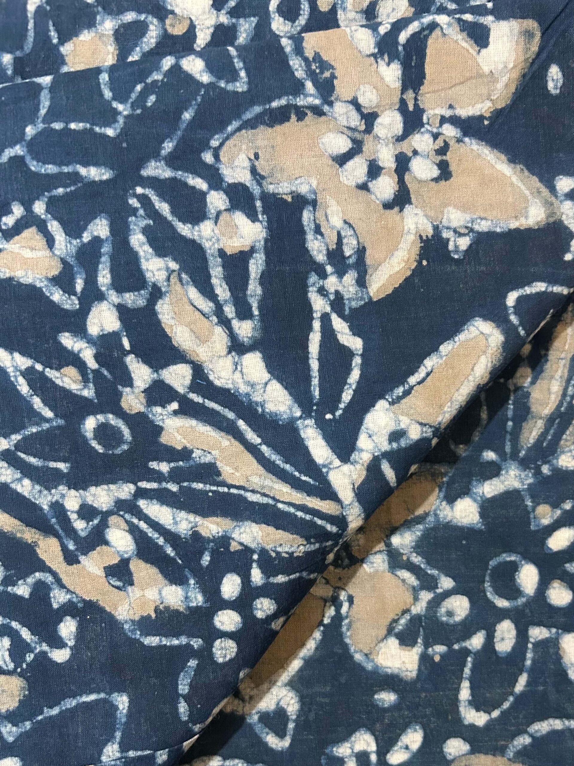 This striking navy blue floral cotton fabric brings together the depth of indigo dye with the warmth of natural sand beige tones for a truly distinctive look. Created using traditional printing technique, the large floral and leaf motifs are rendered in crisp white and soft warm beige against a rich navy ground — a sophisticated three-tone palette that feels both earthy and elegant.