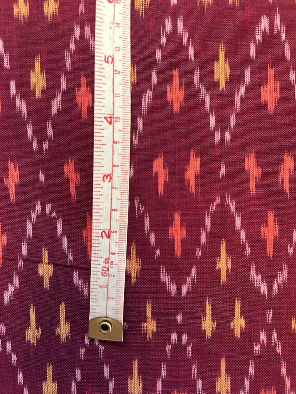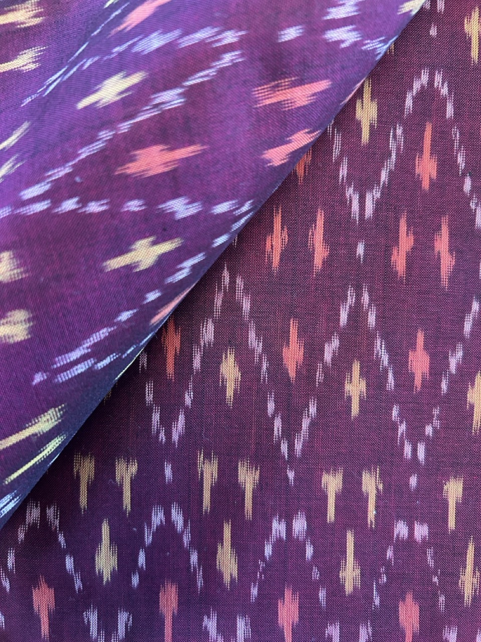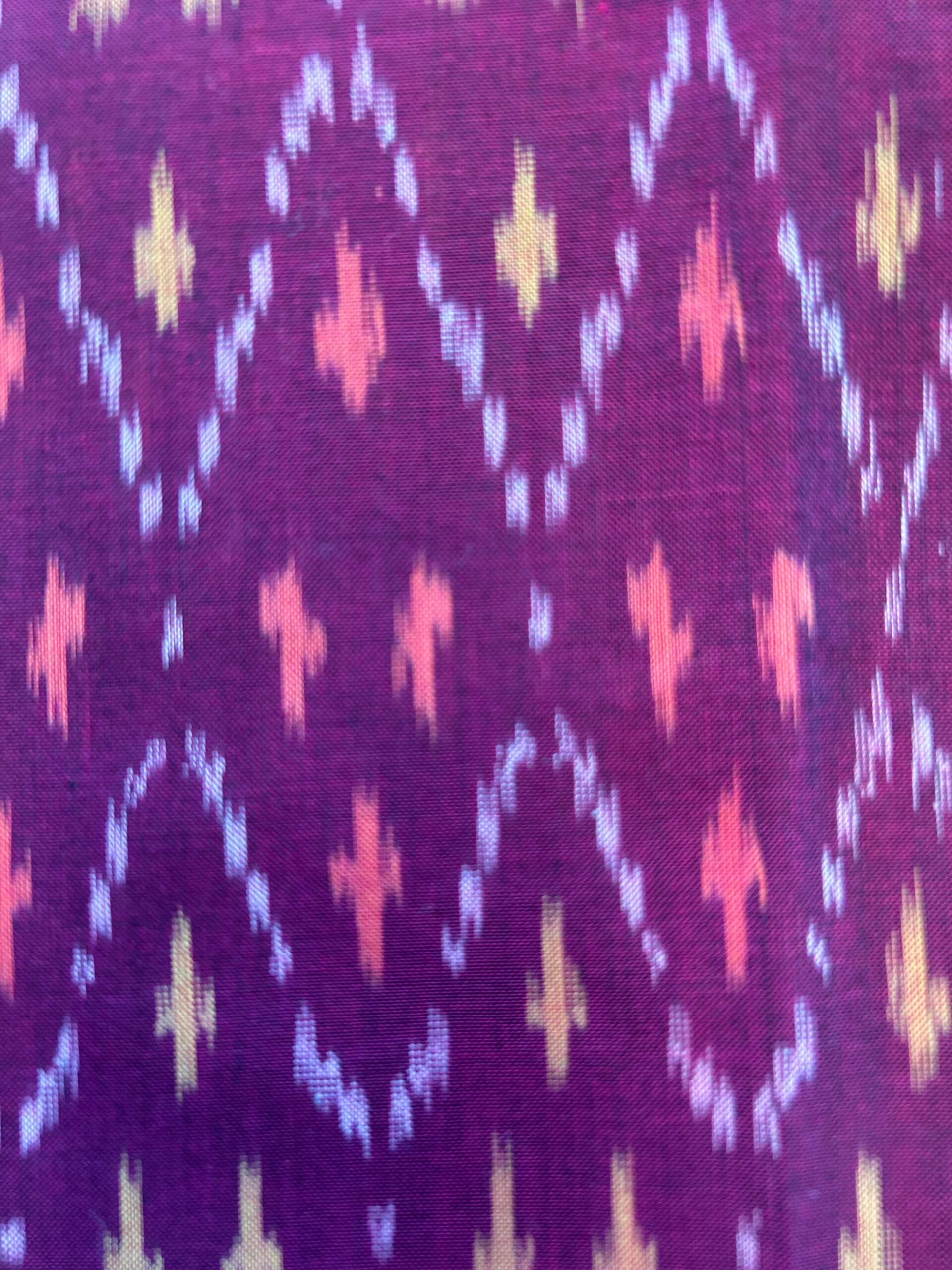 Every effort has been made to accurately portray the colours used in this Maroon Mercerized Ikat Fabric, however individual monitor settings and other factors may cause discrepancies. The colour is a more maroon than purple colour.