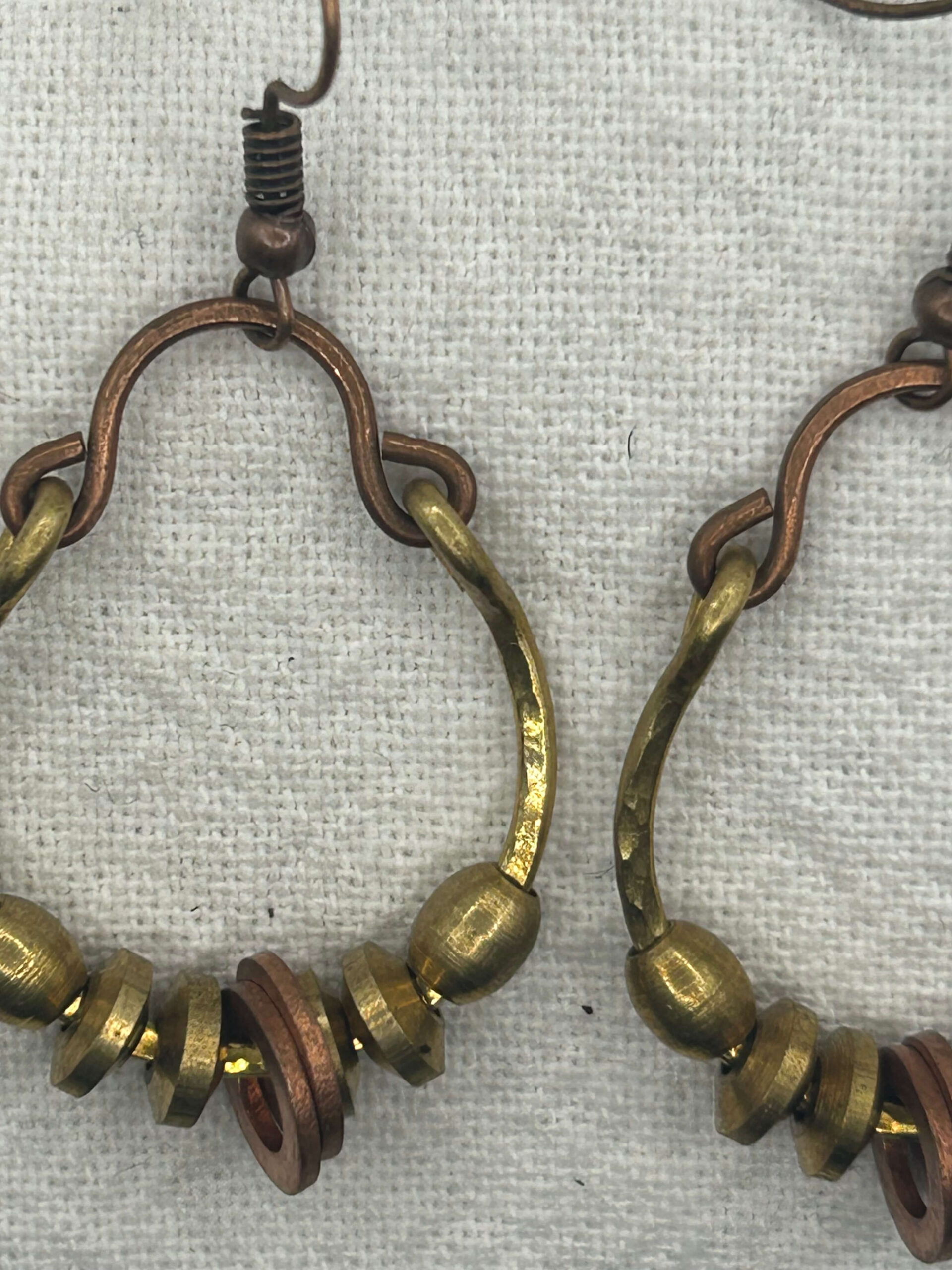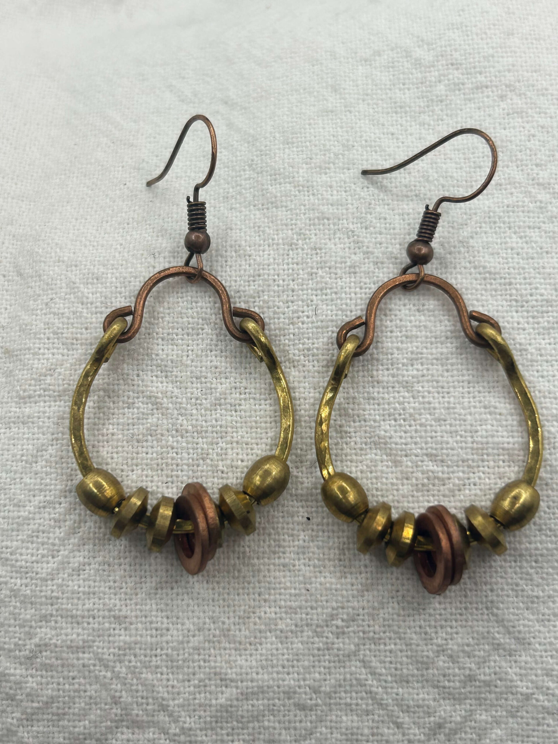 These dangly earrings are a solid brass hoop with raw copper and brass beads that have been hand hammered to add texture.