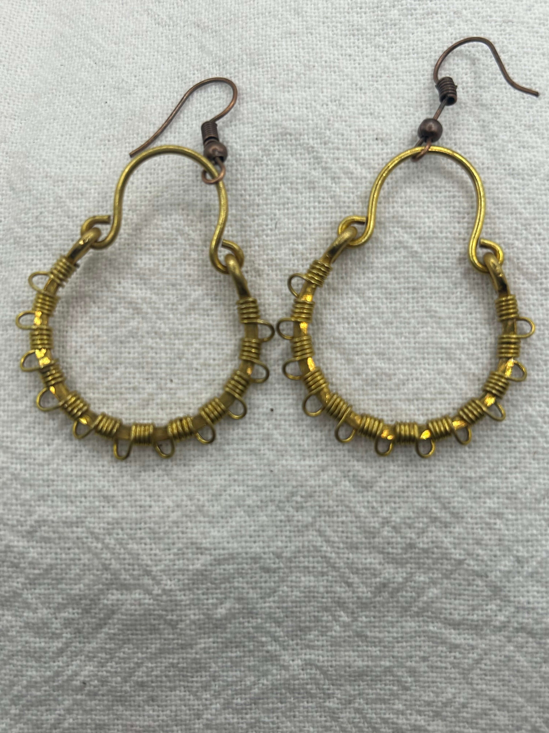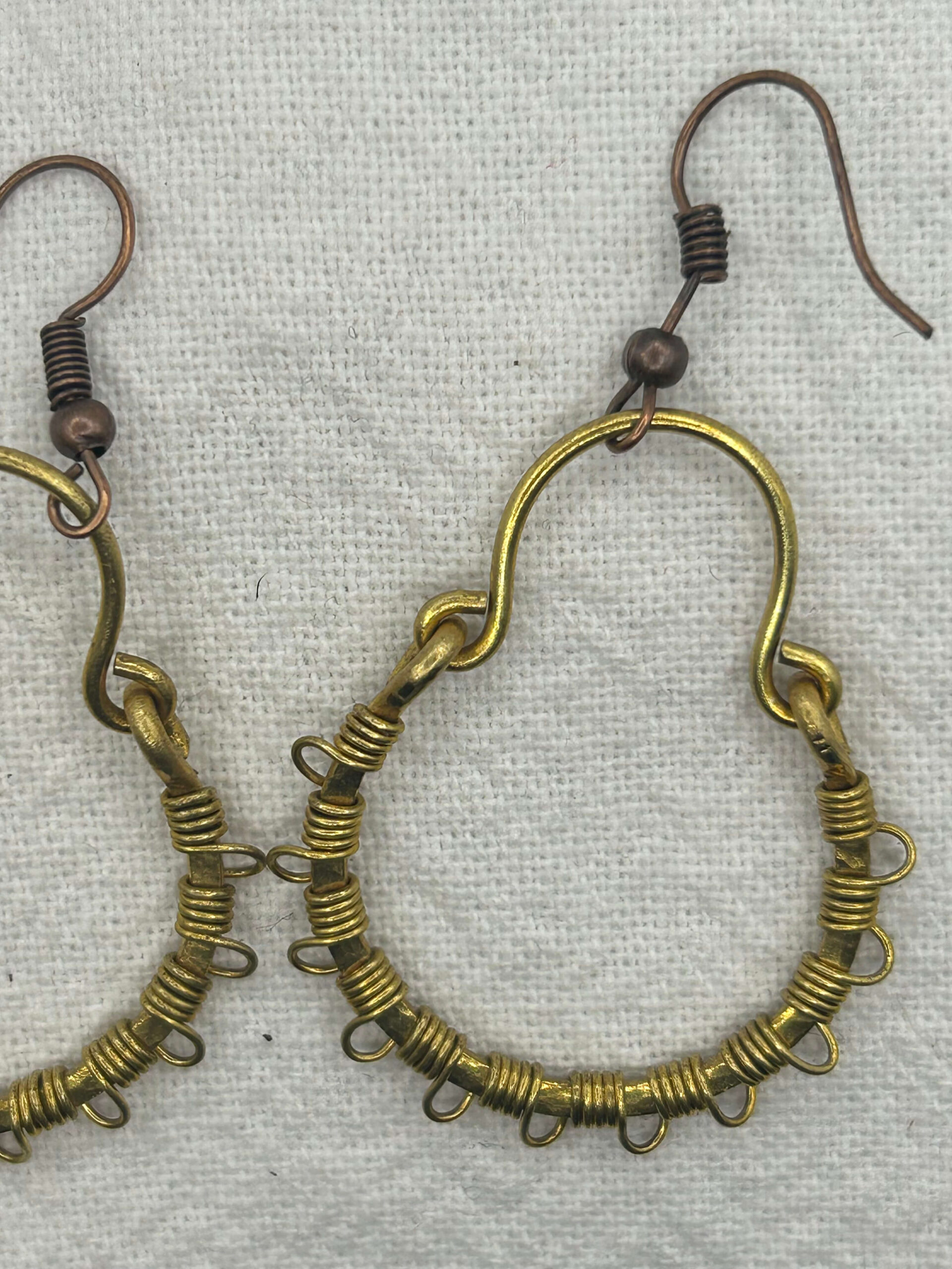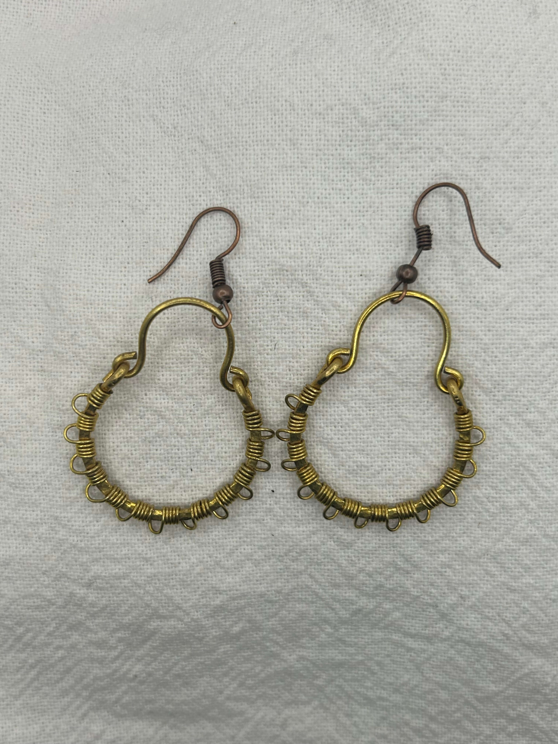 These dangly hoop earrings are solid raw brass that have been hand hammered to add texture and then wrapped with brass wire.