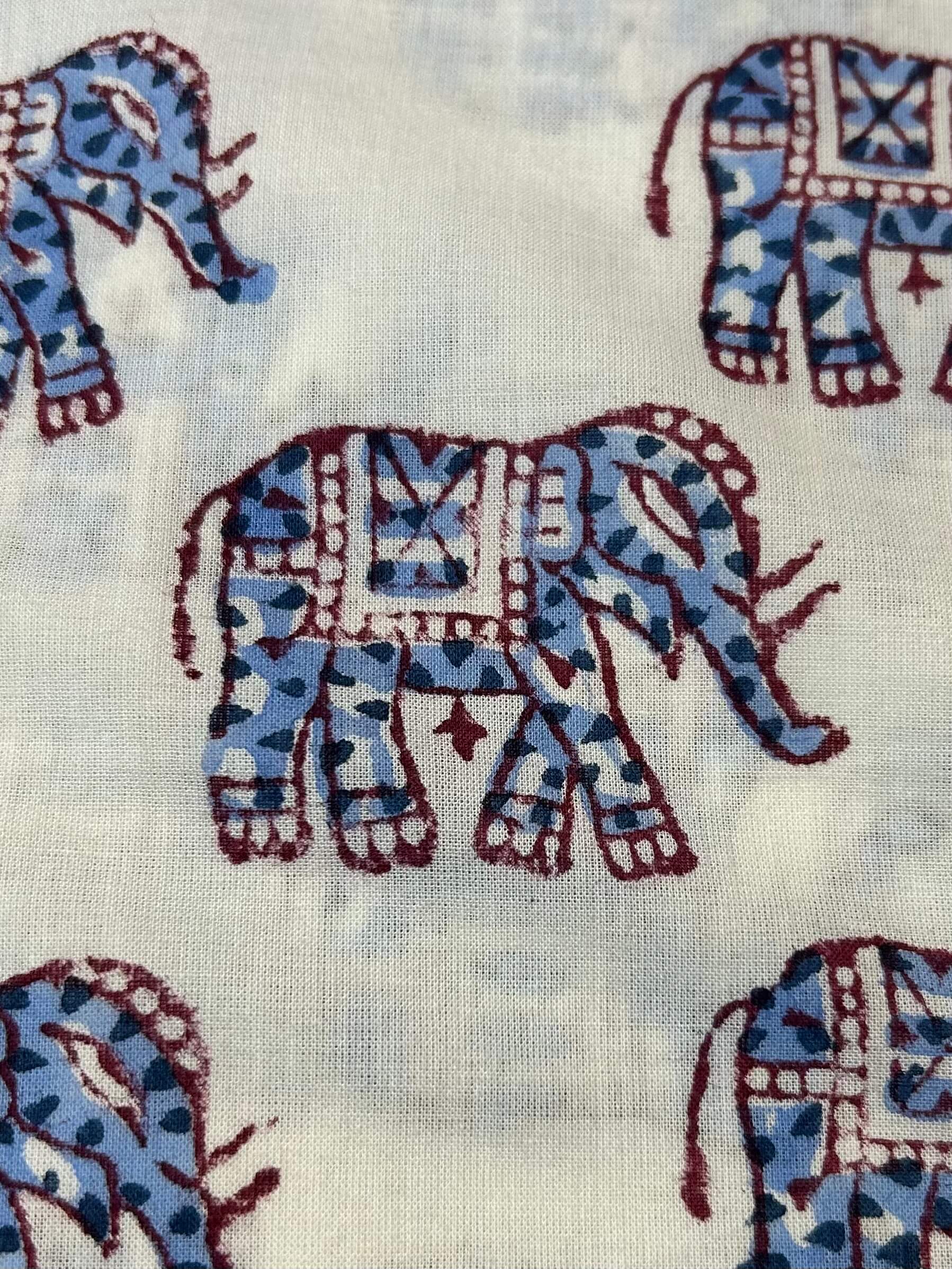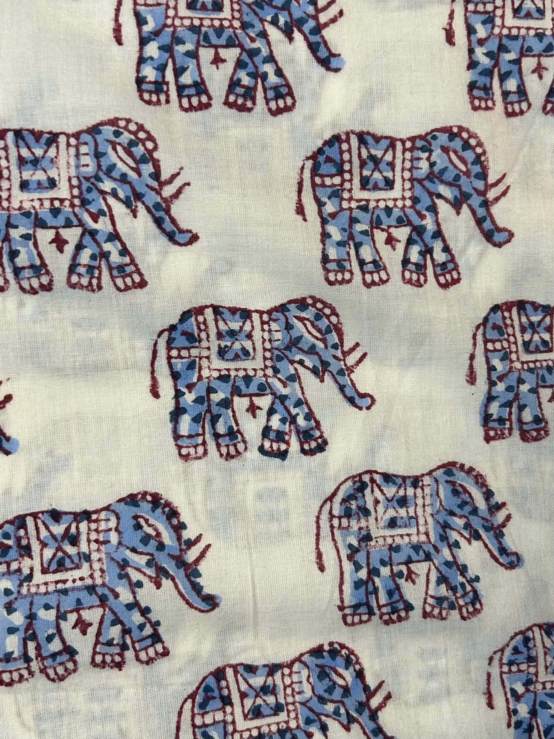 Celebrate the grandeur of Indian folk art with this charming elephant block print cotton fabric. Featuring beautifully adorned elephants in periwinkle blue and deep burgundy on a crisp white ground, this fabric is hand block printed using carved wooden blocks in the traditional Jaipur style.