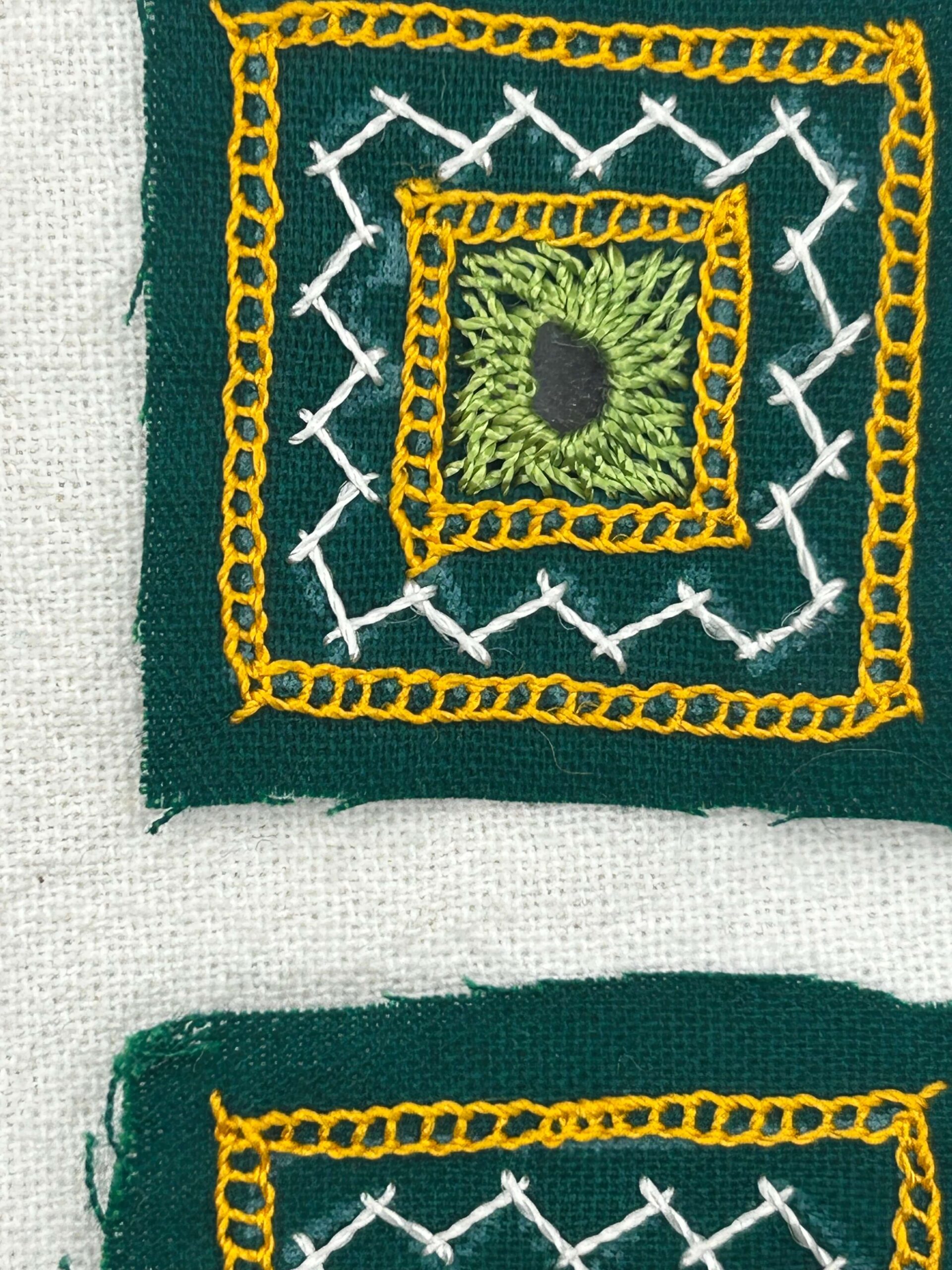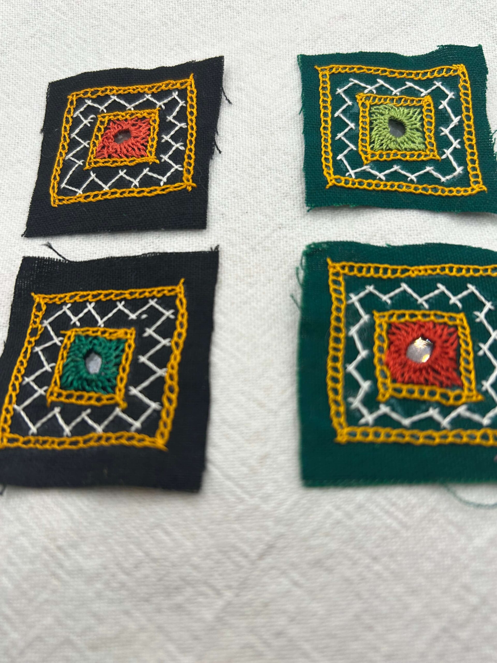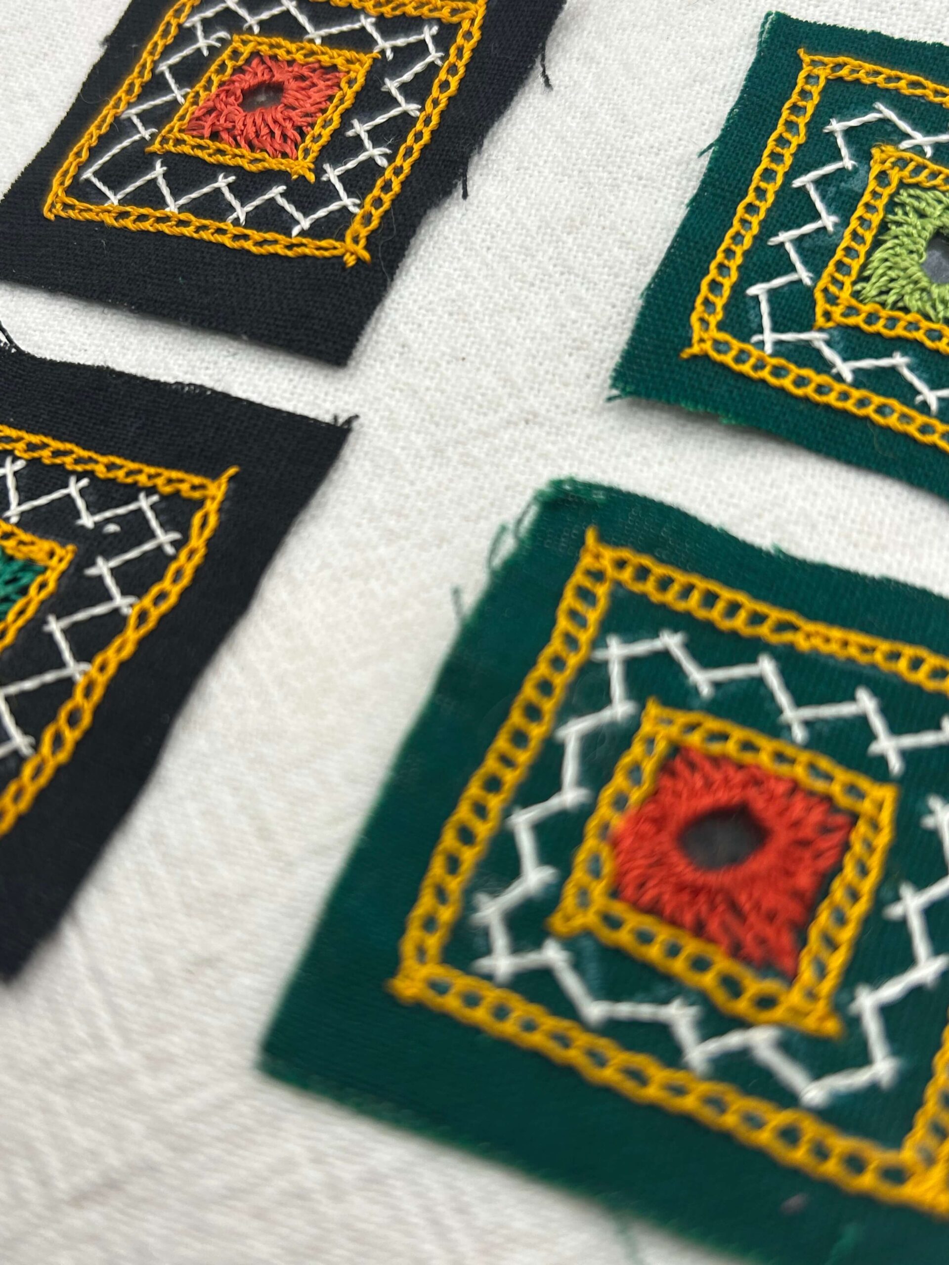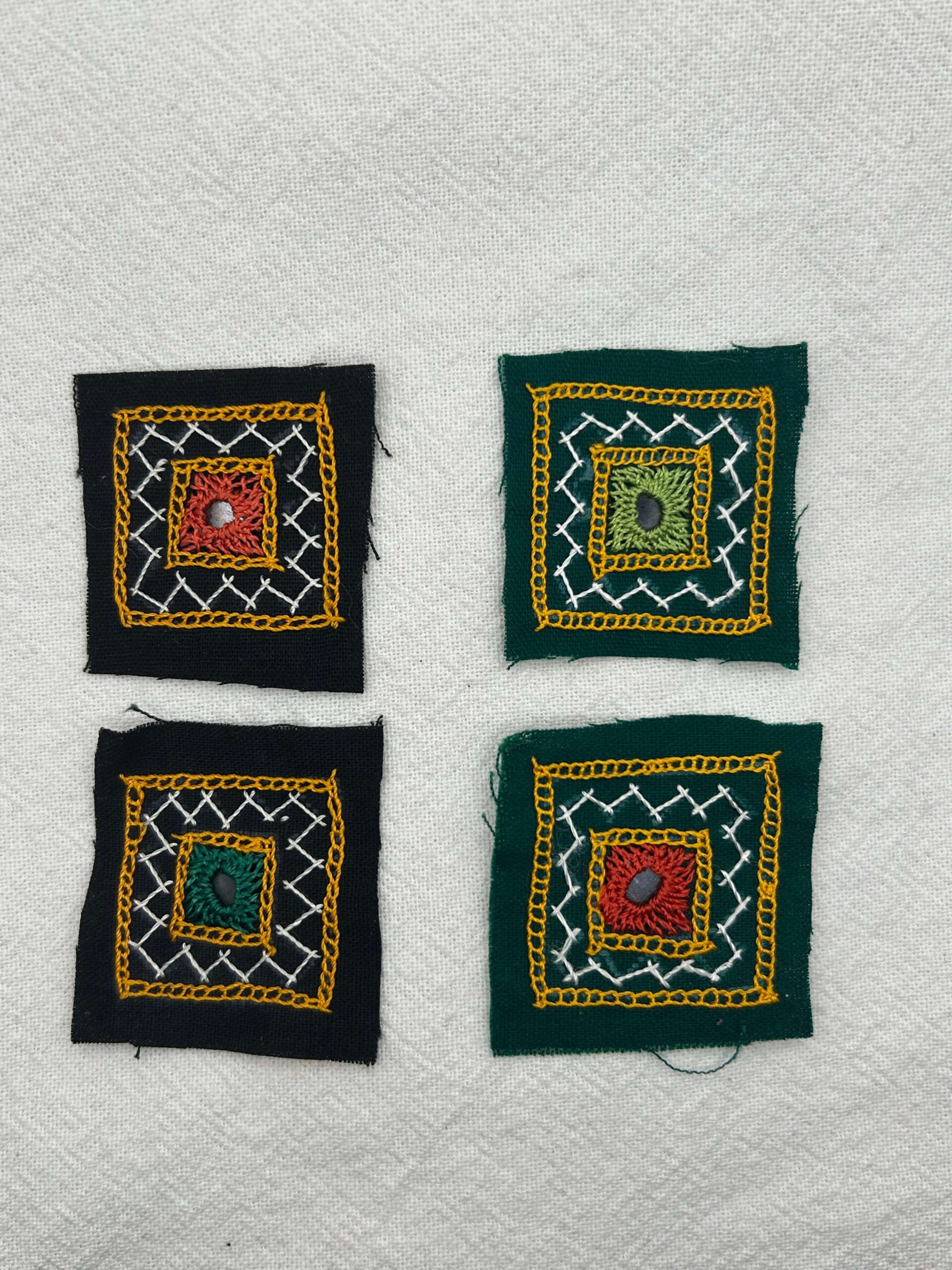 Embroidery patch is approximately 3.5 x 3.5 cm and is on a forest green cotton fabric. Centre is Green or Red.