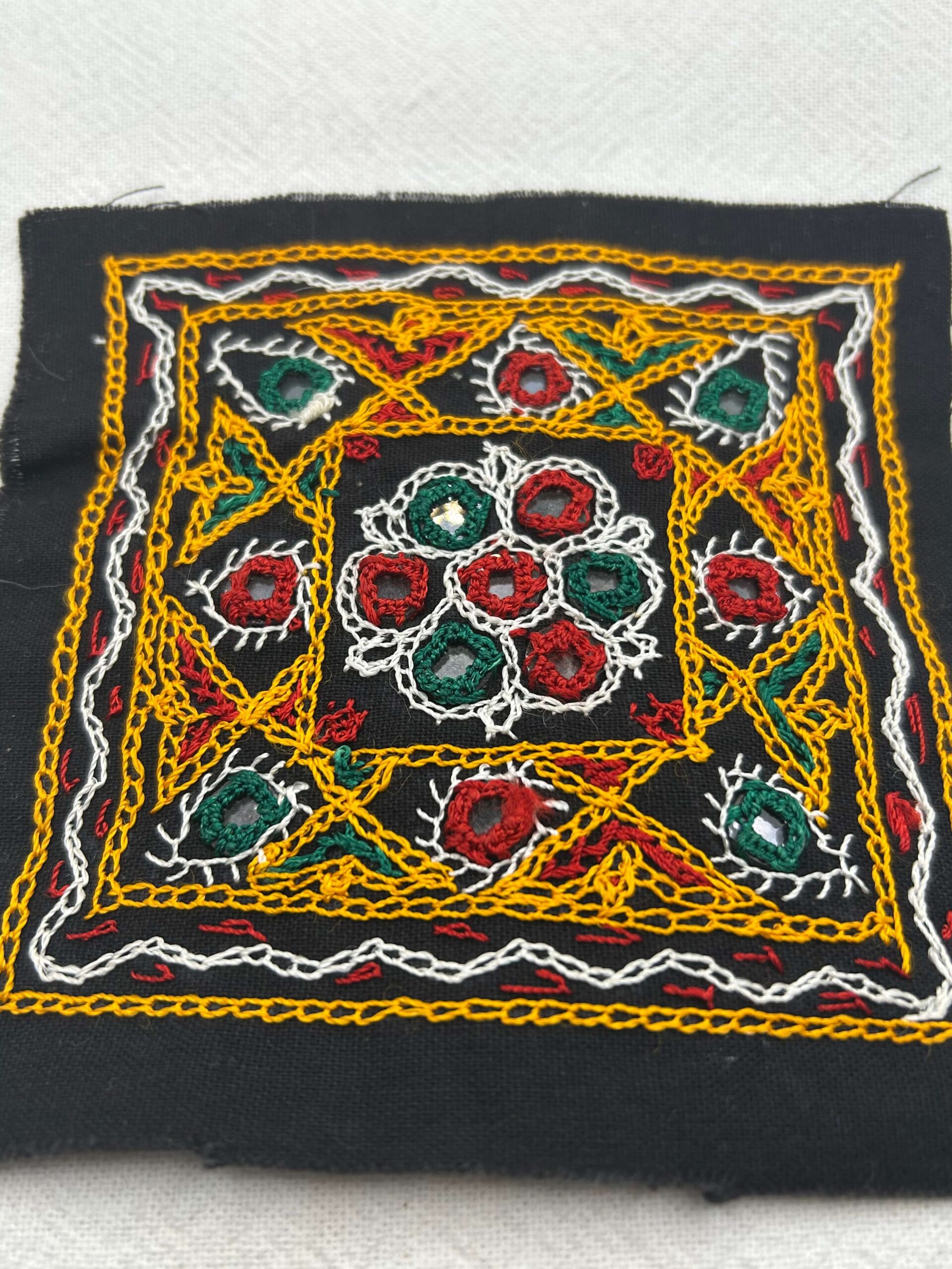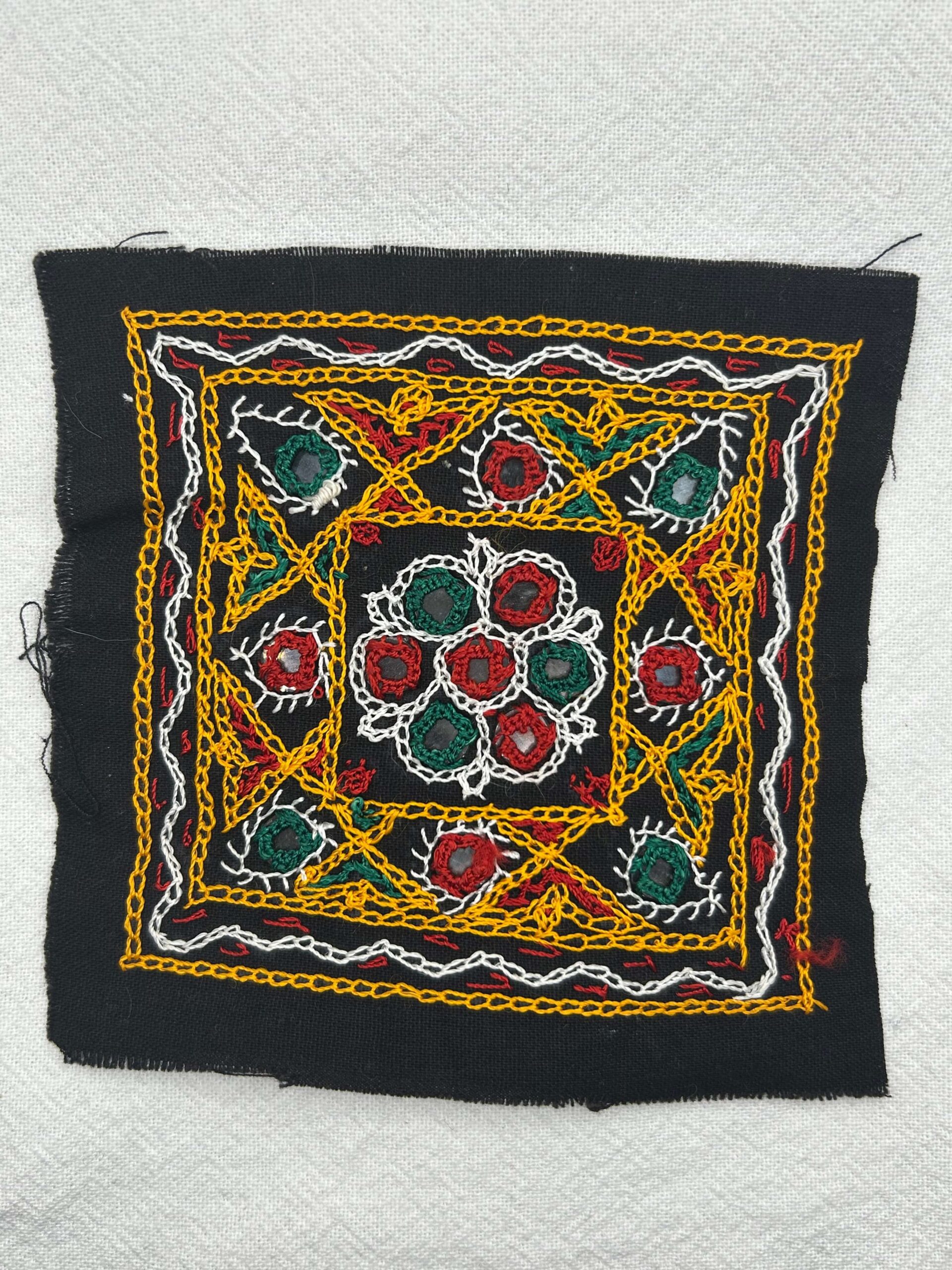 Medium red Kutch hand-embroidered square patch. Perfect for vibrant embellishments on jackets, bags, and creative DIY projects.