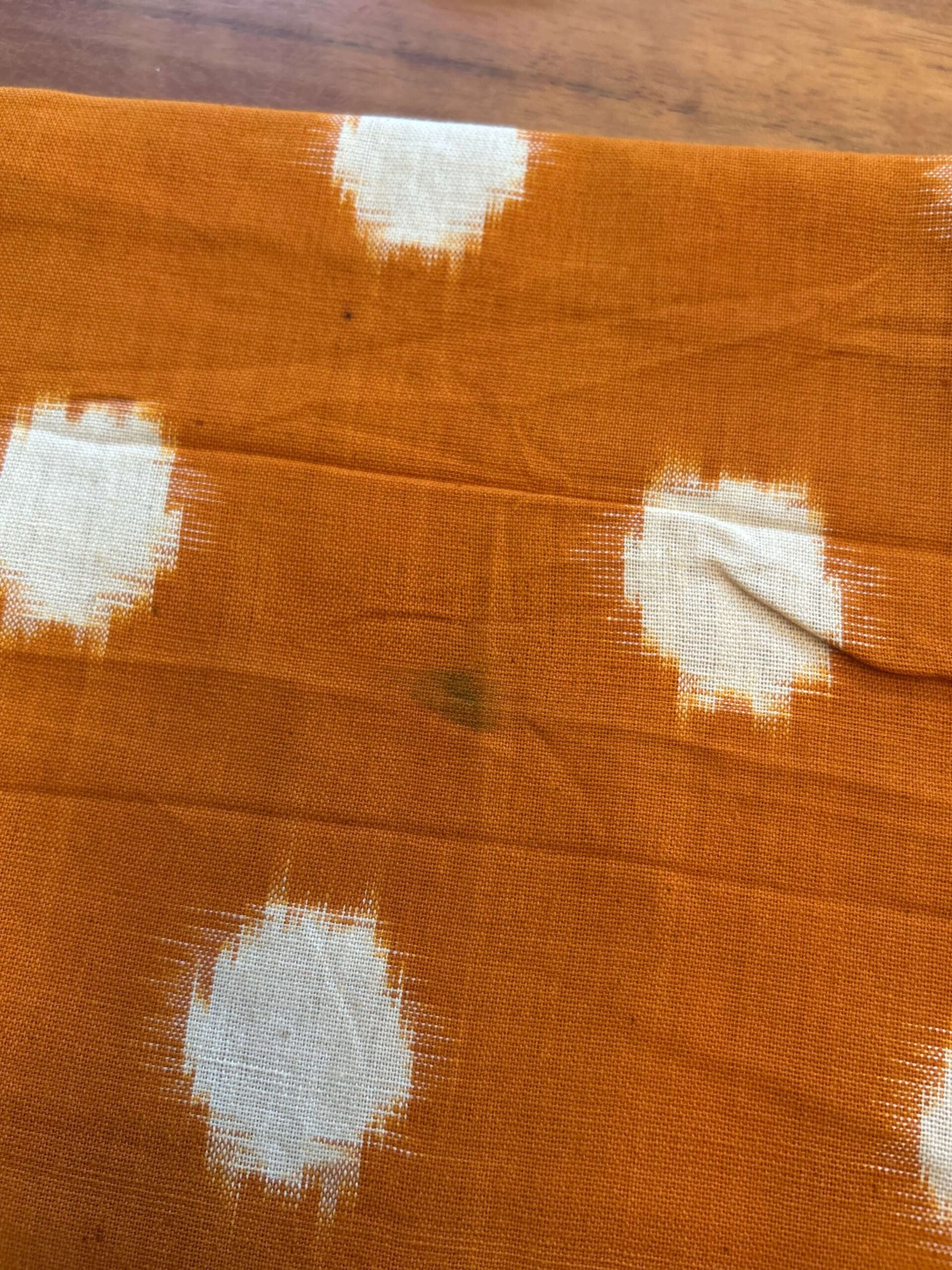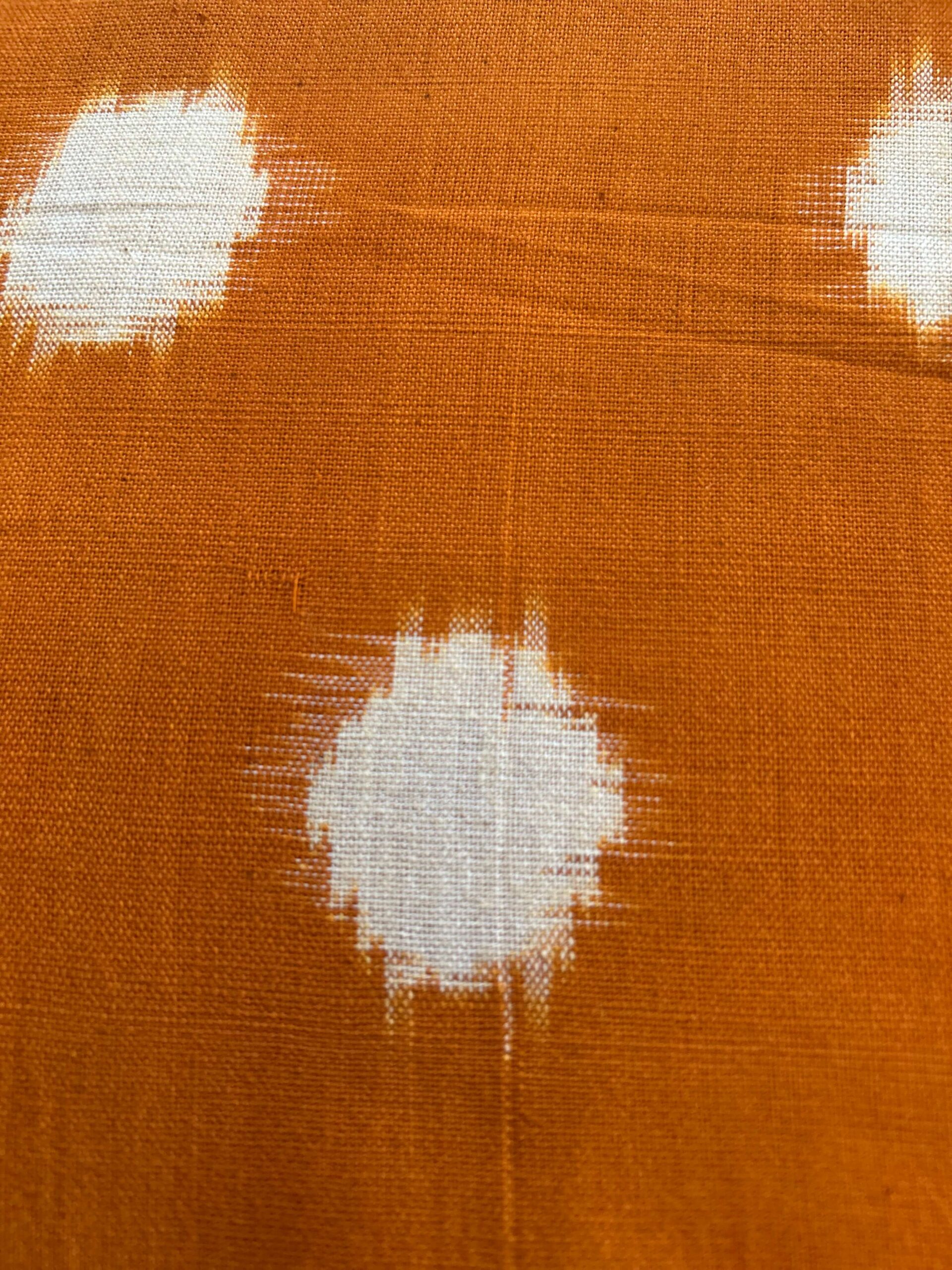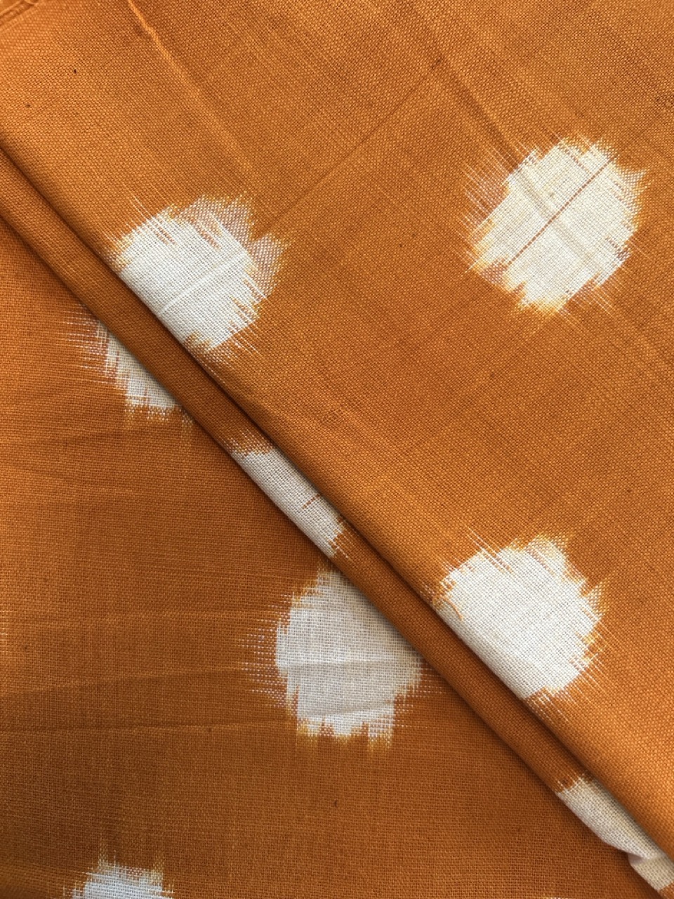 Every effort has been made to accurately portray the colours used in this Orange & White Ikat Fabric, however individual monitor settings and other factors may cause discrepancies. The fabric is a rich, golden orange colour.