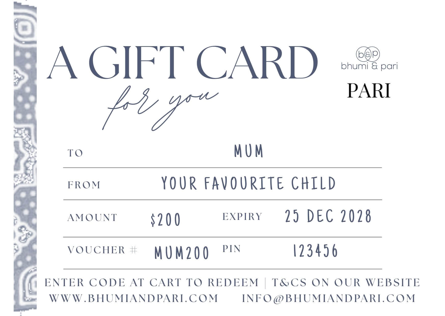 Give the gift of choice with a Bhumi & Pari Digital Gift Card — the perfect present for anyone who loves Indian-inspired fabrics, handmade accessories, colourful home décor and beautifully curated artisan pieces. Whether you’re celebrating a birthday, saying thank you, sending love from afar, gifting for Christmas, Mother’s Day, housewarmings, bridal showers, or simply treating someone “just because,” our gift card makes every occasion feel special.
