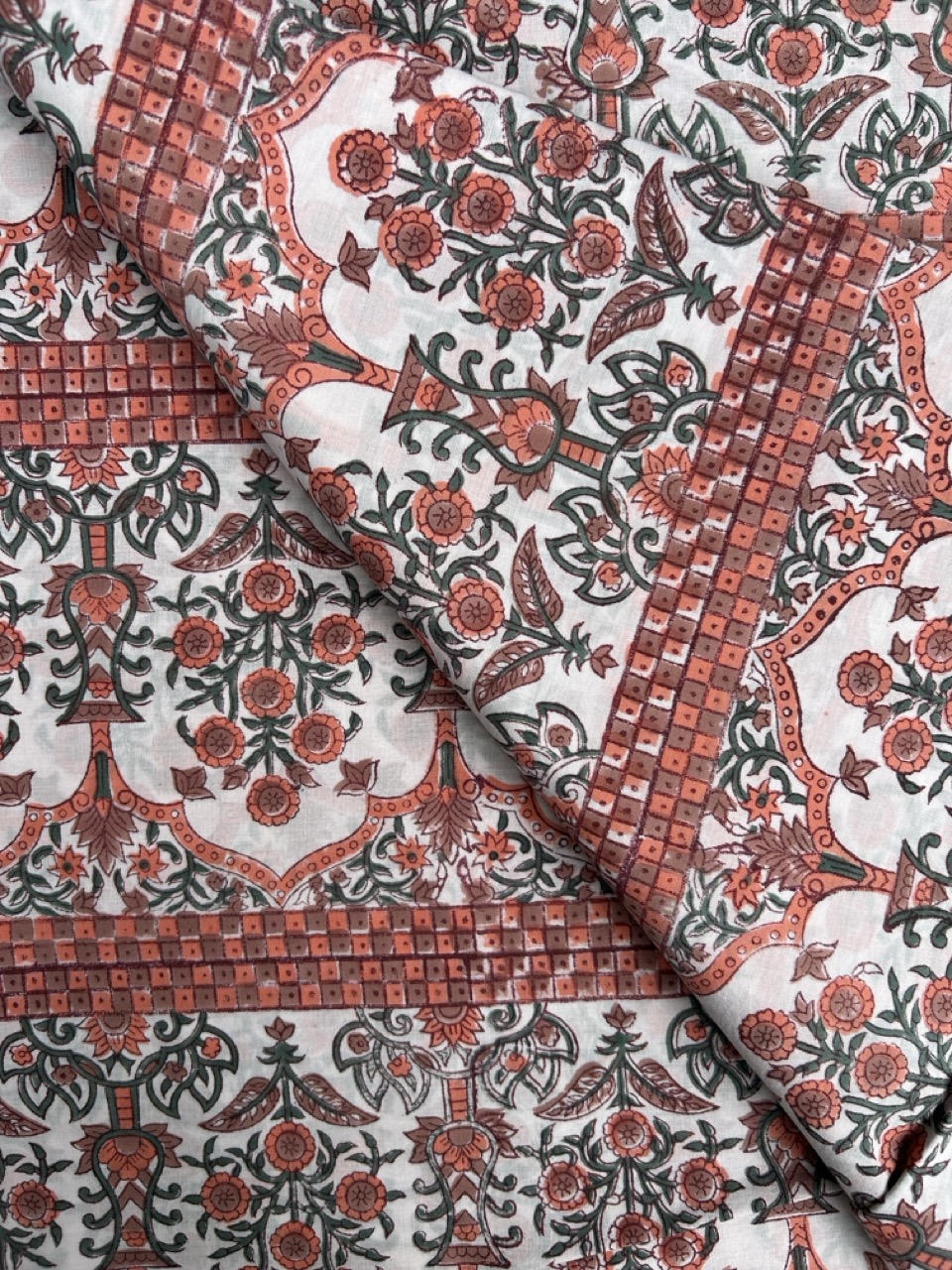 This exquisite fabric showcases the precision of hand block printing with its unique arched “mihrab” style layout. Warm terracotta pink flowers are meticulously stamped alongside sage-green foliage, creating a rhythmic and regal aesthetic. This fabric is ideal for statement clothes, elegant scarves, or artisanal cushion covers that require a touch of tradition.